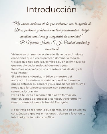 Un camino de 30 días y 205 páginas orientado a iniciar un proceso profundo de restauración interior. A través de reflexiones diarias inspiradas en la Sagrada Escritura, oraciones sencillas y ejercicios formativos, la persona es guiada a revisar su historia con una mirada nueva, permitiendo que la luz de la fe ilumine sus heridas, recuerdos y experiencias.